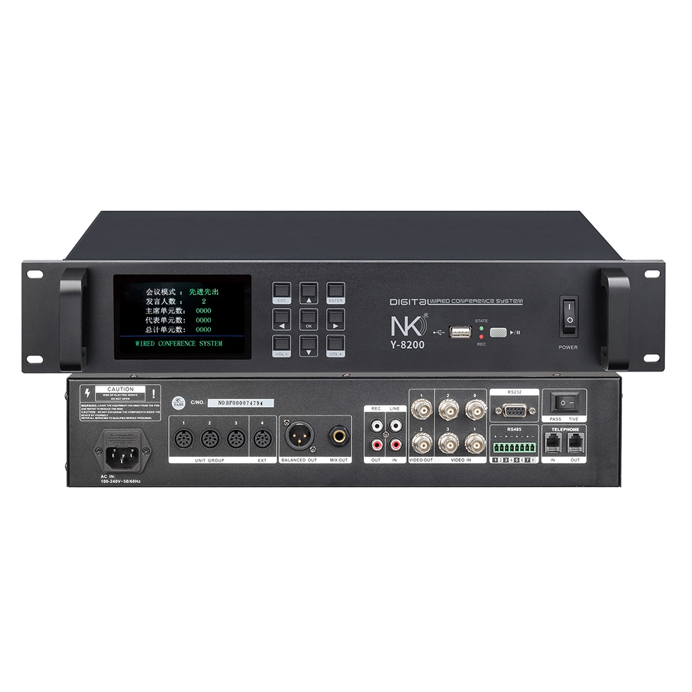 ·连接摄像头可实现发言实时视像追踪功能,支持4路摄像头信号输入,2路视频输出;